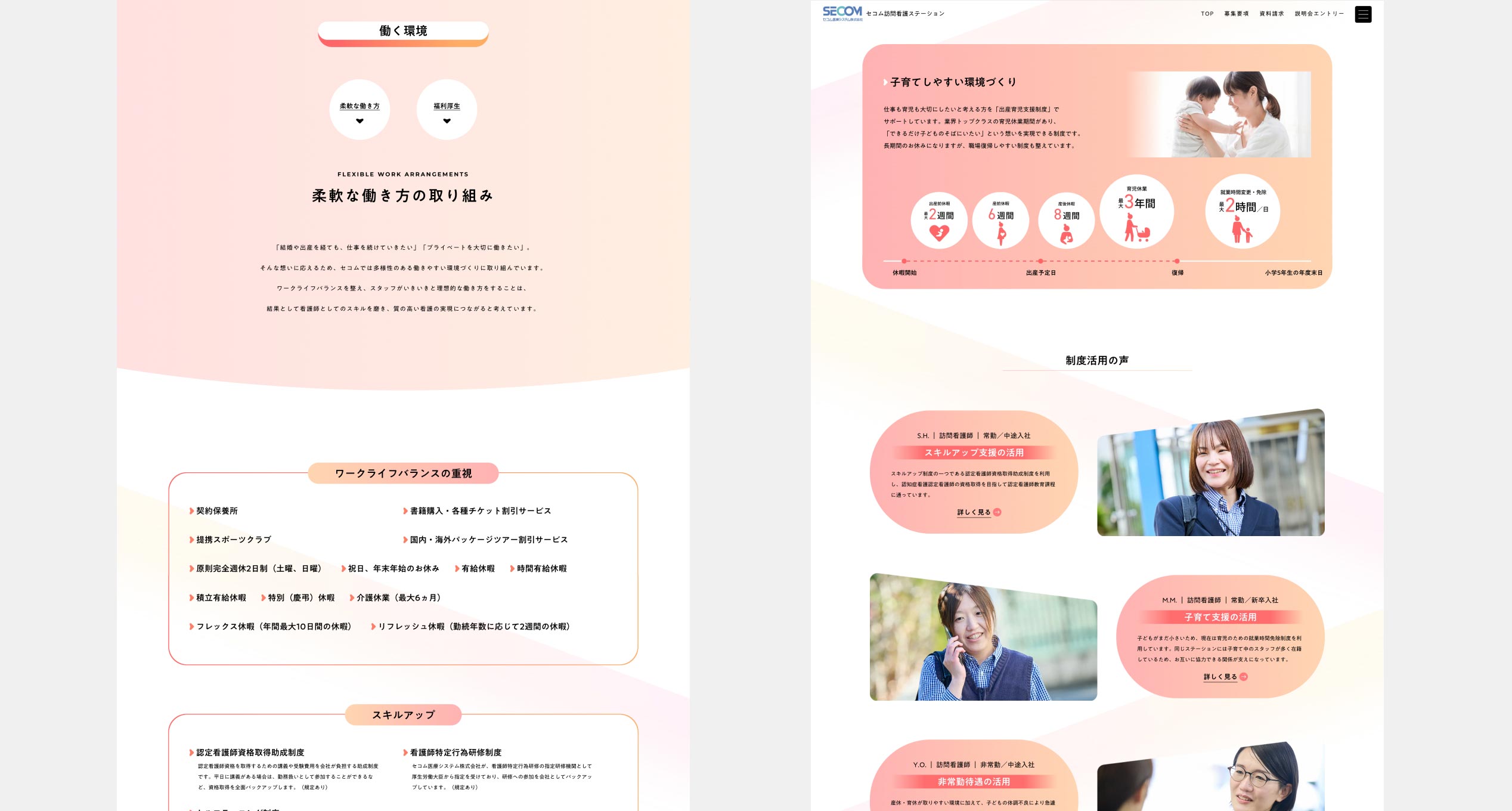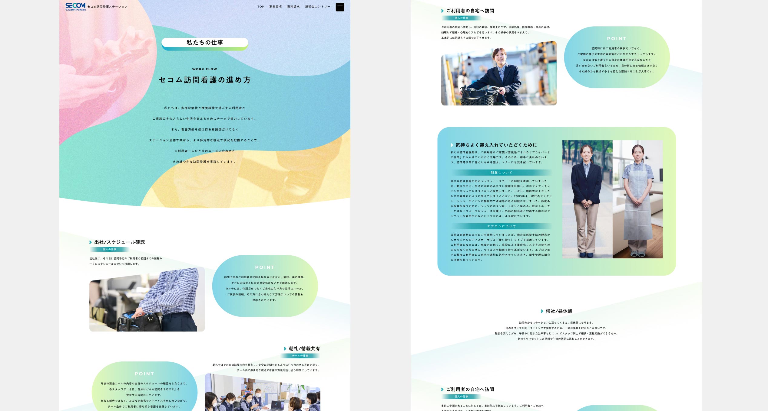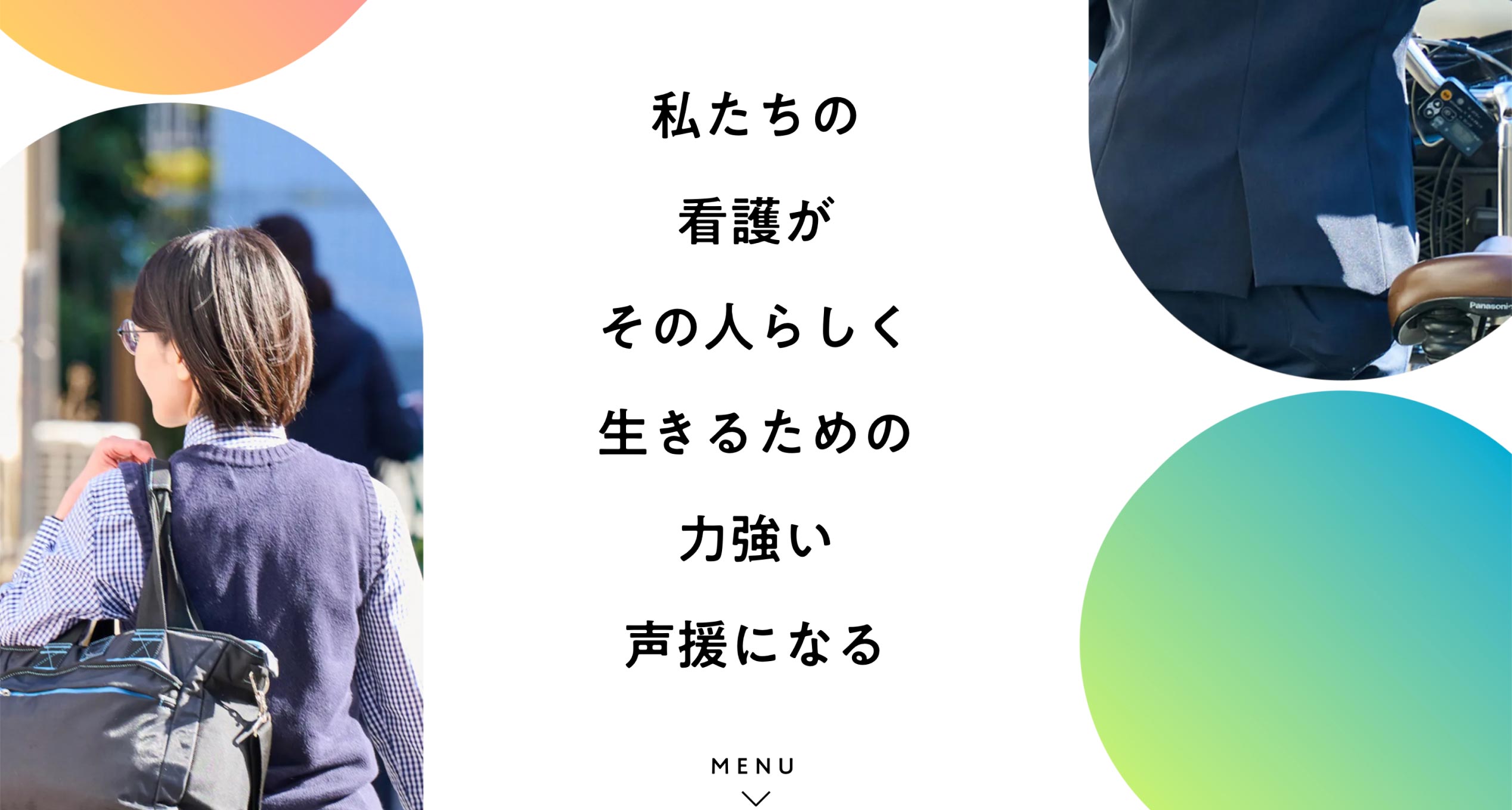 採用スローガンでは訪問看護師としての本質的な価値を定義し、各ページでは従業員一人ひとりを大切にする企業の姿を伝えています。