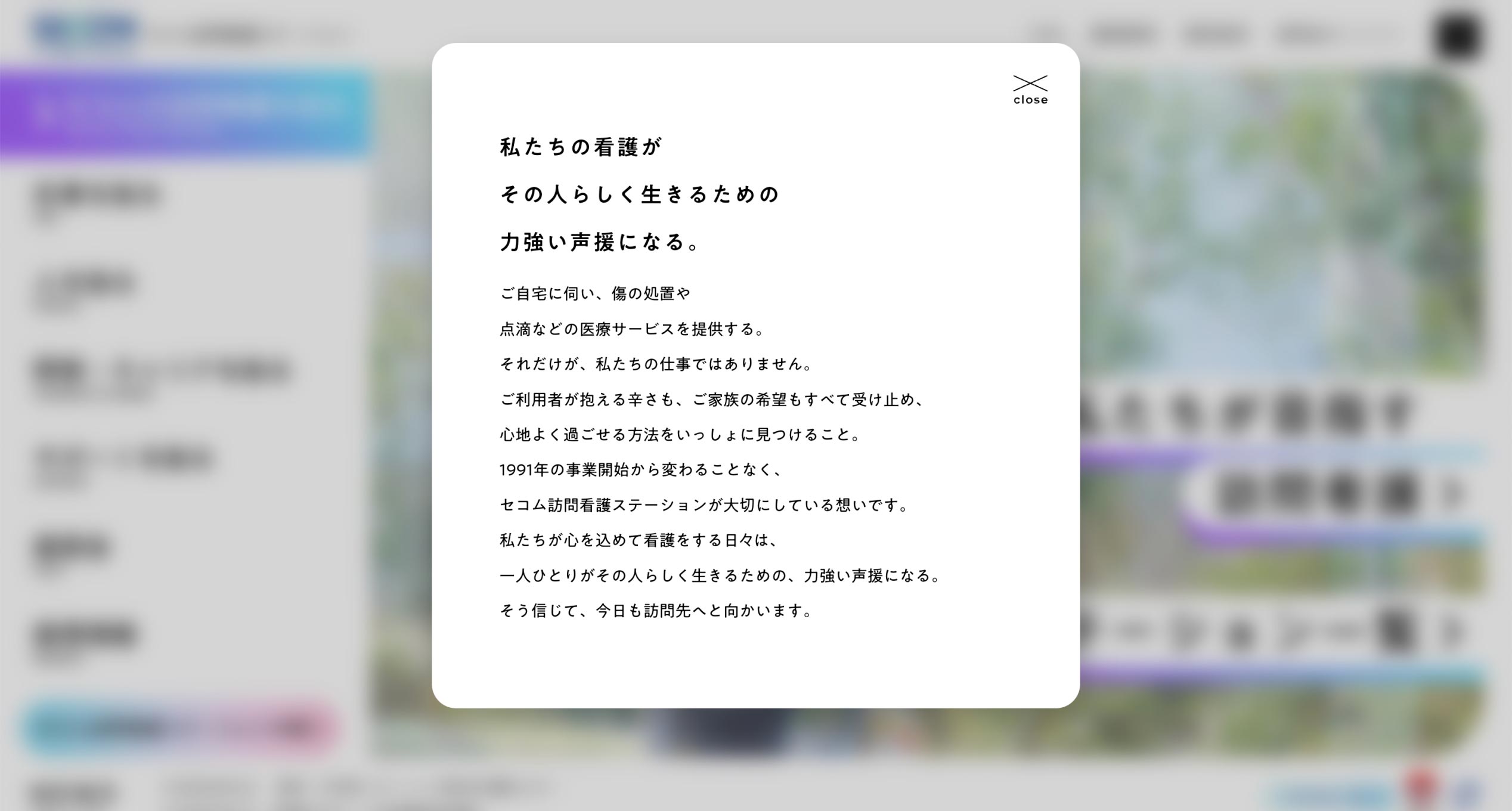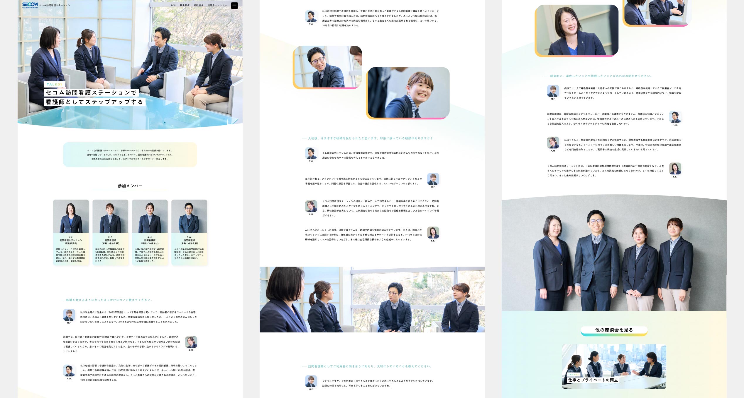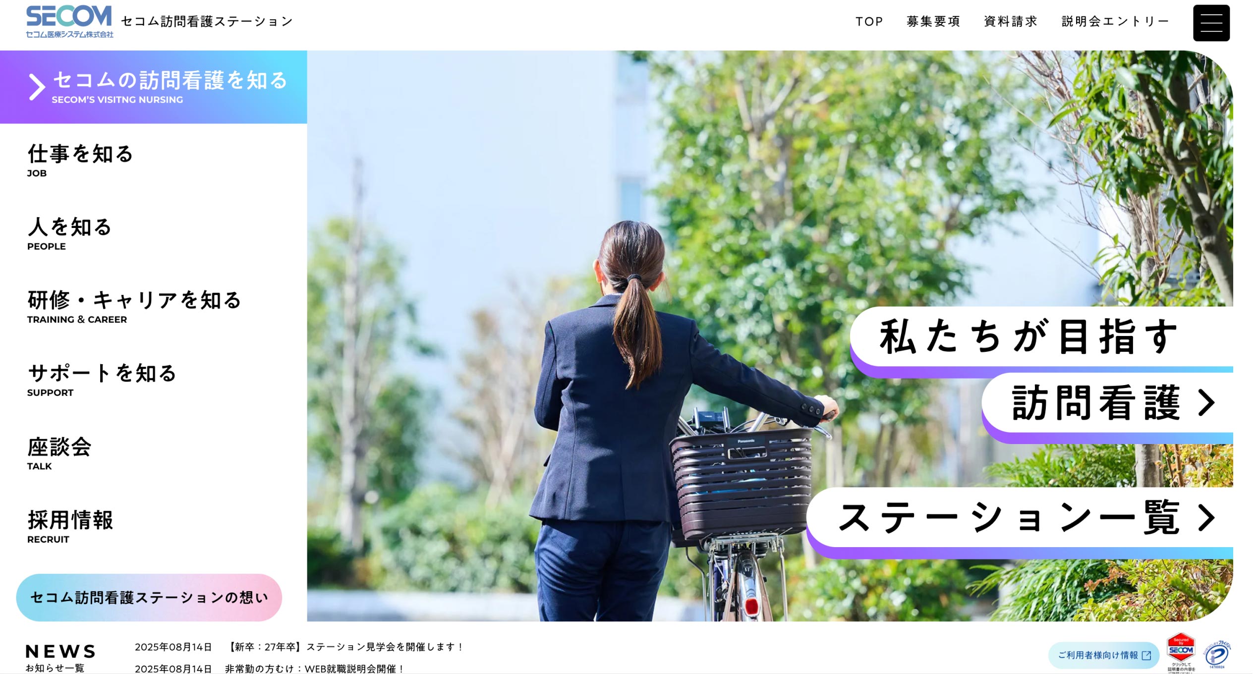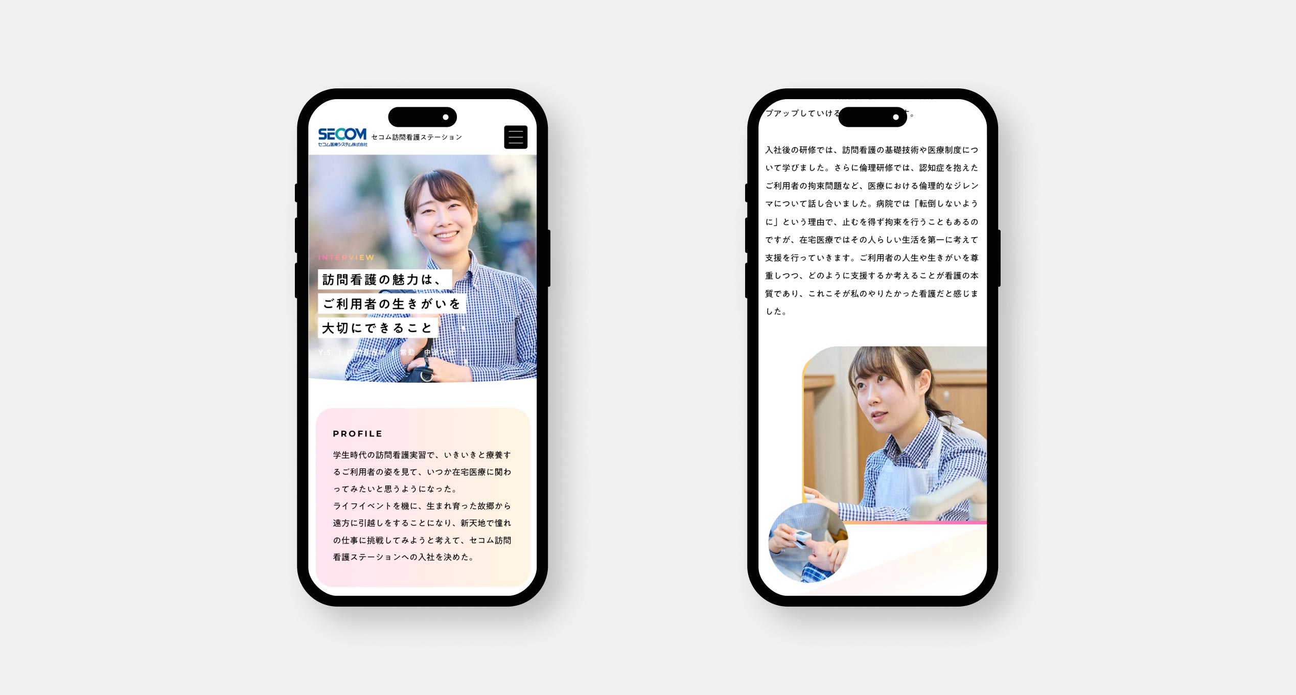 採用スローガンでは訪問看護師としての本質的な価値を定義し、各ページでは従業員一人ひとりを大切にする企業の姿を伝えています。